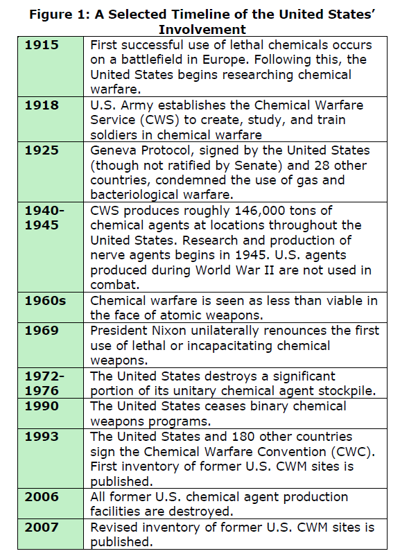 The United States’ long history relating to chemical warfare stretches back to before World War I. Once chemical warfare was a battlefield reality, to protect our Military Forces on the battlefield and to ensure they had the capabilities needed to defeat our nation’s adversaries, the United States developed several research and development facilities, chemical and filling plants, proving grounds, and chemical training areas. Today, the United States, a signatory to the Chemical Weapons Conventions (CWC), is in the process of destroying the last of its chemical munitions stockpile. As such, the United States no longer maintains an offensive chemical warfare capability. The DoD has already cleaned up several former chemical facilities and training areas located in the United States and continues to do so today. Some of the major events relating to the involvement of the United States in chemical warfare are presented in Figure 1.